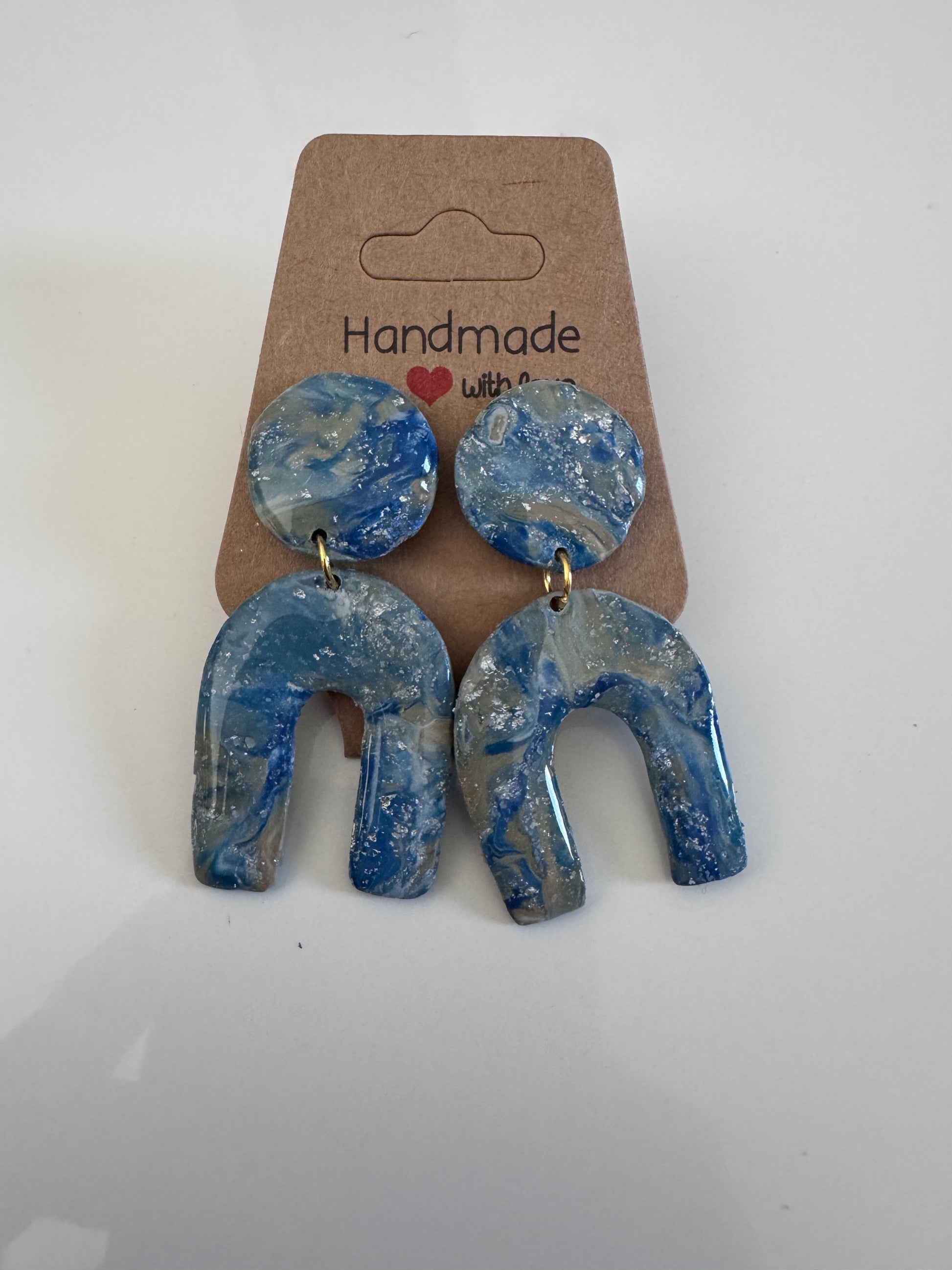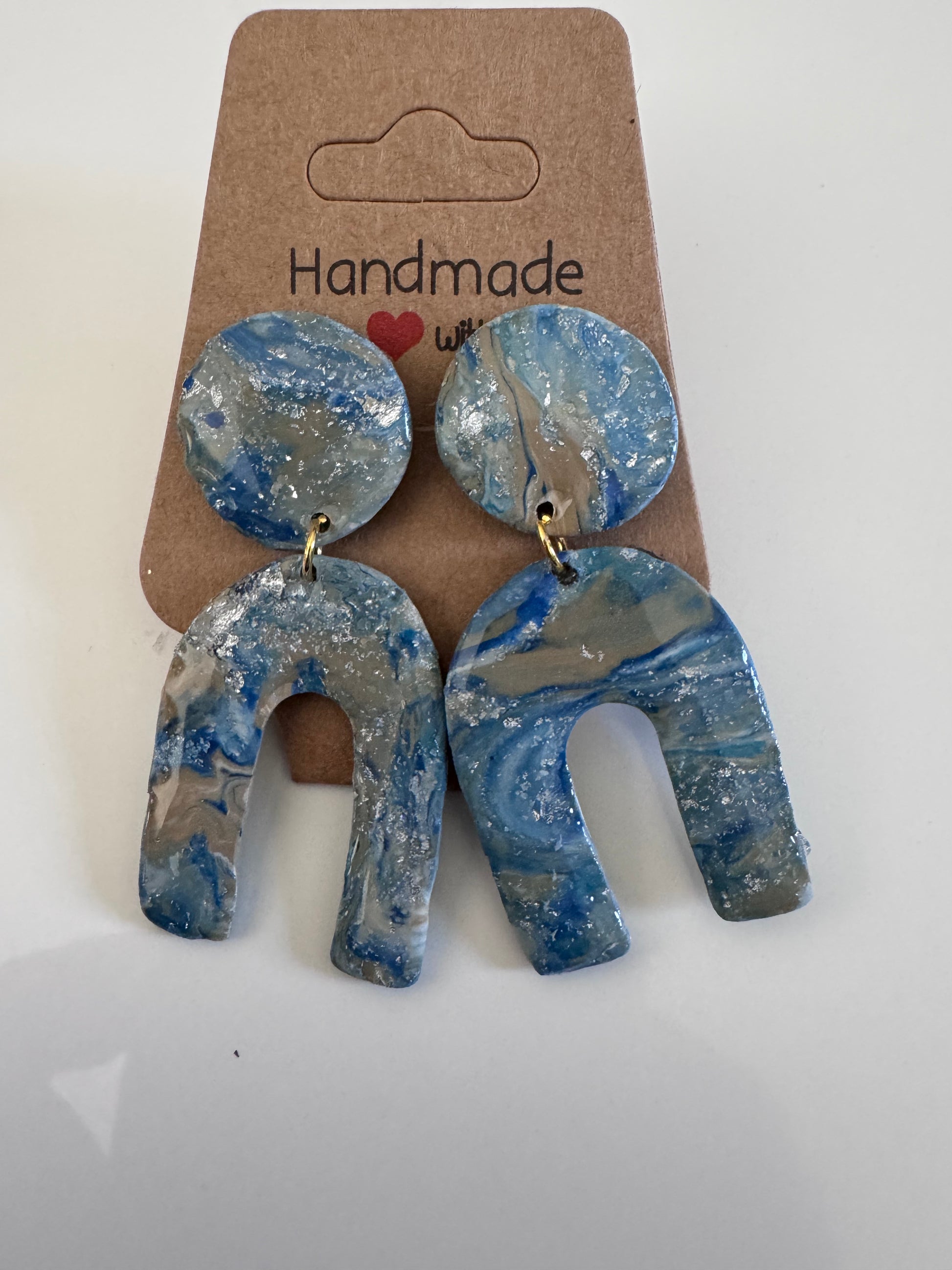 These earrings capture the swirling beauty of river stones and rushing water. Handmade with polymer clay and flecked with shimmering accents, each piece is completely unique, durable, and lightweight — perfect for adding a natural sparkle to any day.